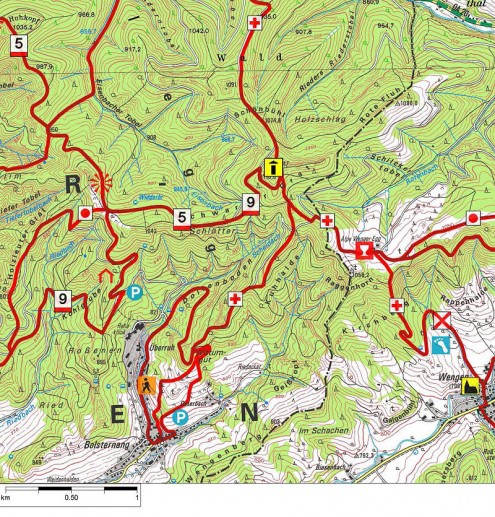 - Von Schwarzerd (900 m) am Eschacher Weiher vorbei auf dem SAV-Weg mit rotem Punkt, 10 km, Anstieg 218 m.