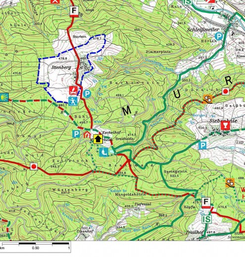 - Murrhardt – Trauzenbachtal – Trauzenbach – Hohe Brach – Erlach – zur B 14 und südl. des TP 496 hinunter ins Fischbachtal – Sulzbach/Murr – Ittenberg – WH, 27 km