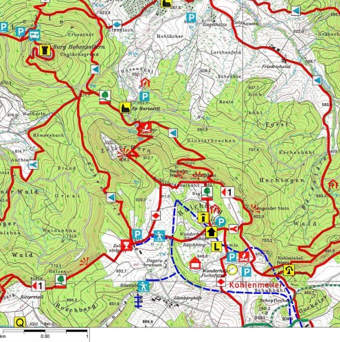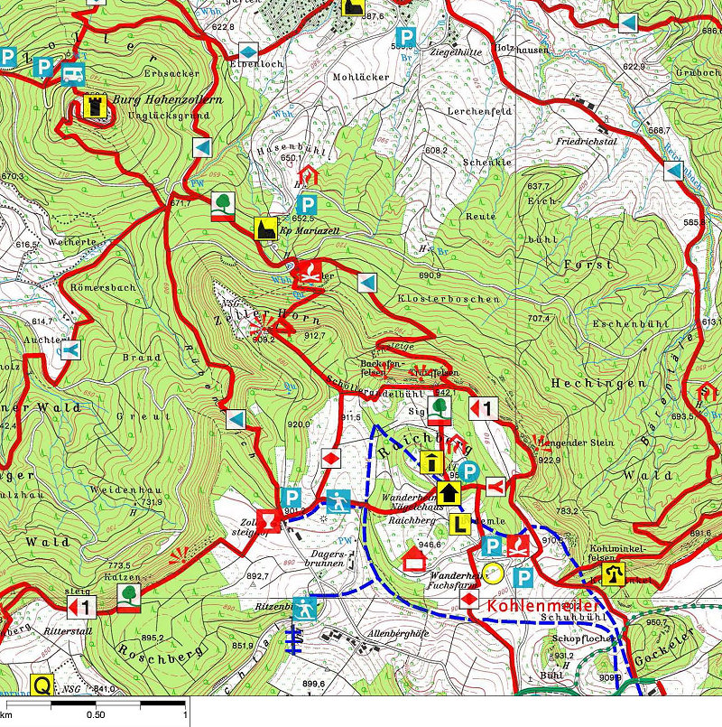 - Zur Burg Hohenzollern: Vom Nägelehaus auf dem Main-Neckar-Rhein-Weg (HW 3) zum Zeller Horn, ein Abstecher zur Wallfahrtskapelle Mariazell ist auch dann lohnend, wenn das hübsche Barockkirchlein verschlossen ist; der Aufblick von dort zur Burg ist immer eindrucksvoll. Vom Sattel beim TP 670 (die Wegführung ist dort unübersichtlich; genau nach Karte gehen) führt der HW 3 dann hinauf zur Burg. Für die Burgführung samt Kaffeepause sind bis zu 2 Stunden zu rechnen. Den Rückweg nehmen wir auf der Zollersteige, der SAV-Weg ist mit einem blauen Dreieck markiert. Vom Zollersteighof zum Nägelehaus kann der Weg nicht verfehlt werden, 9 km